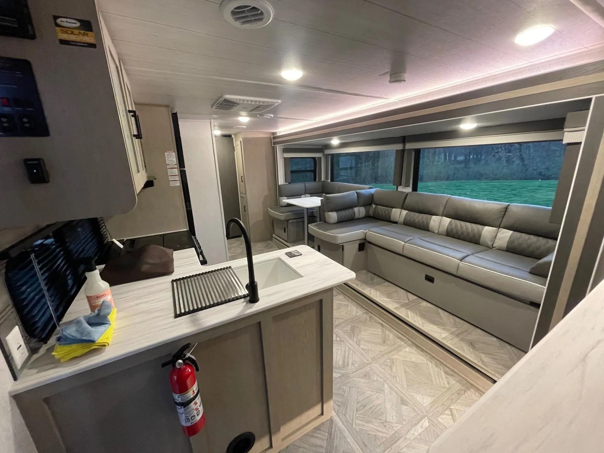 For relaxing, the living area includes comfortable seating, entertainment options, and convenient USB charging ports. Climate is never an issue with dual A/C units to keep you cool.